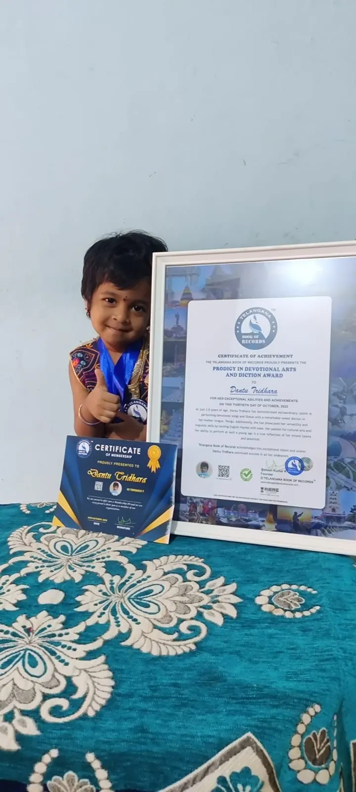Telangana Book of Records acknowledges this exceptional talent and wishes Dantu Tridhara continued success in all her endeavors.