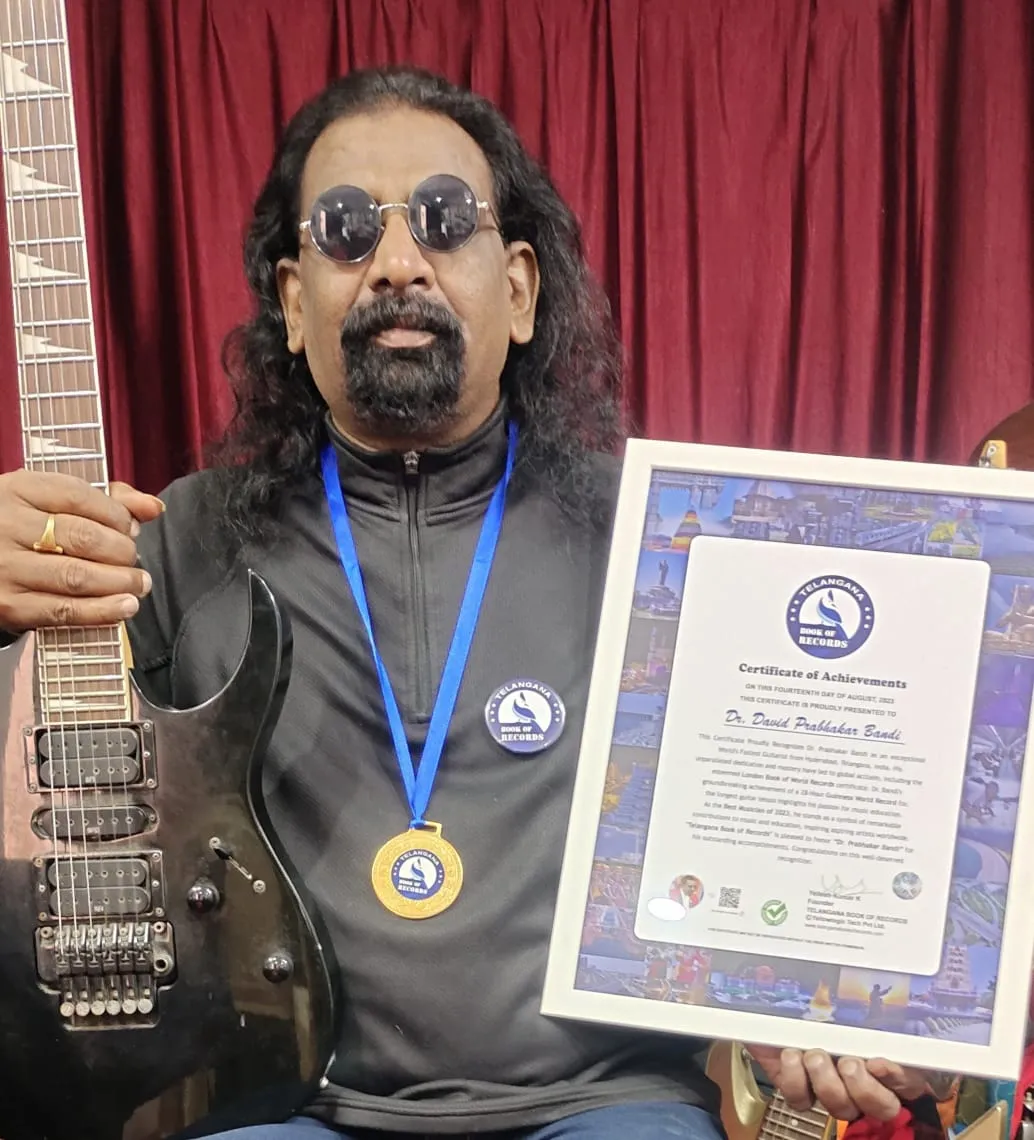 This Certificate Proudly Recognizes Dr. Prabhakar Bandi as an exceptional World's Fastest Guitarist from Hyderabad, Telangana, India. His unparalleled dedication and mastery have led to global acclaim, including the esteemed London Book of World Records certificate. Dr. Bandi's groundbreaking achievement of a 28-Hour Guinness World Record for. the longest guitar lesson highlights his passion for music education.