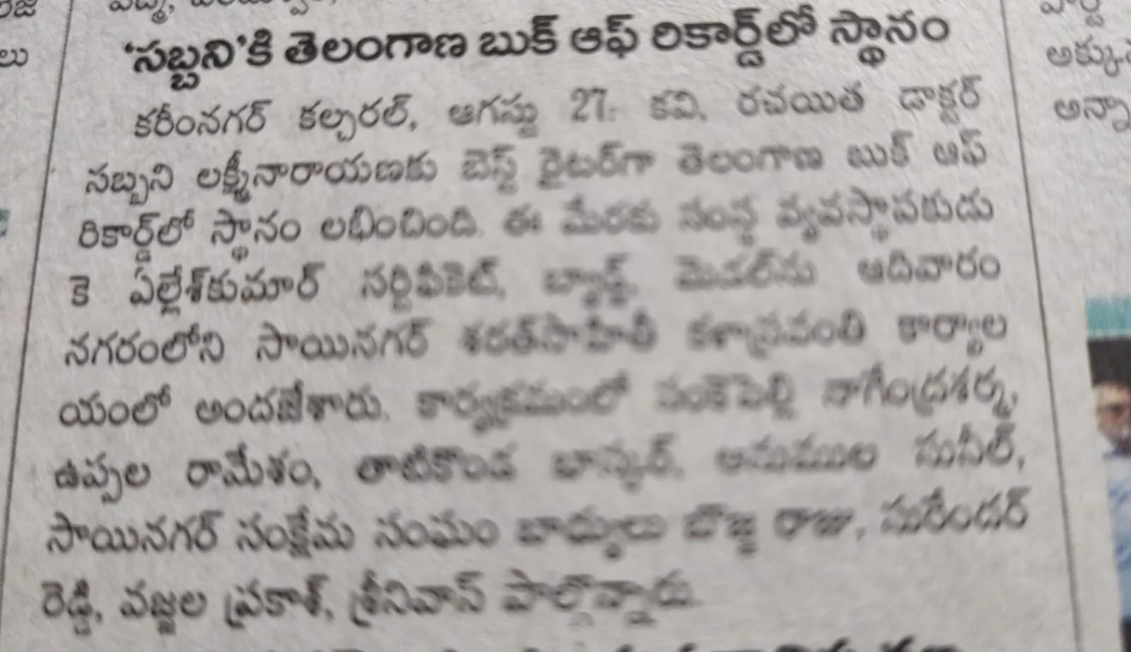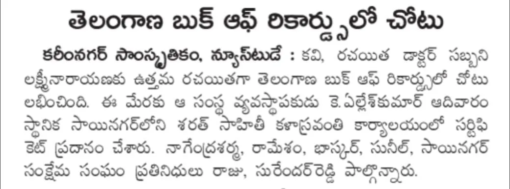 Exceptional adulation and ovation are extended to Sabbani Laxminarayana. A seasoned poet, Accomplished story writer, Insightful essayist, Adept Translator, Prolific novelist, and Evocative lyricist, his journey reflects unwavering dedication and creative prowess.