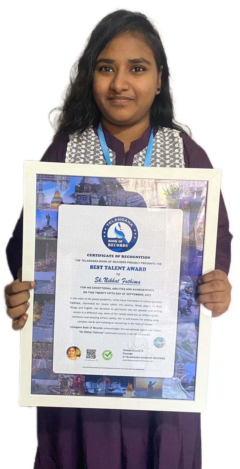 Telangana Book of Records acknowledges this exceptional talent and wishes “Sk.Nikhat Fathima” continued success in all her endeavors.
