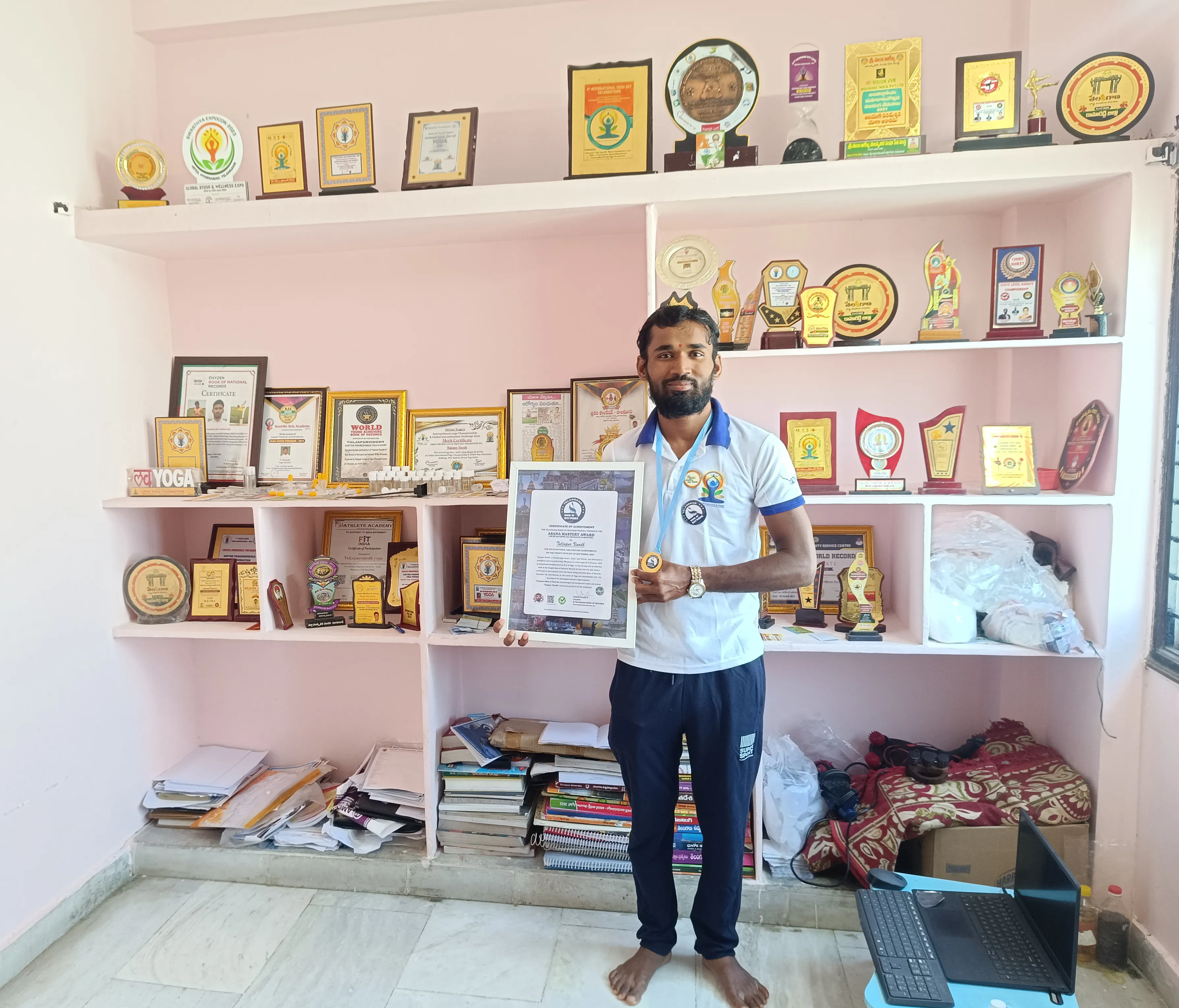 Tuljapur Vinodh, a revered yoga expert, coach, and referee, has showcased a prodigious talent by performing 100 asanas in a mere span of 10 minutes. With an educational background of an M.Sc in Yoga, he has not only left an indelible mark in the Oxygen Book of National Records for this feat but also holds a certificate of participation from the World Young Achievers Book of Records. Moreover, his contributions to the world of Yoga are monumental with the founding of the Aadiyogiparmeswara Yoga Academy.
