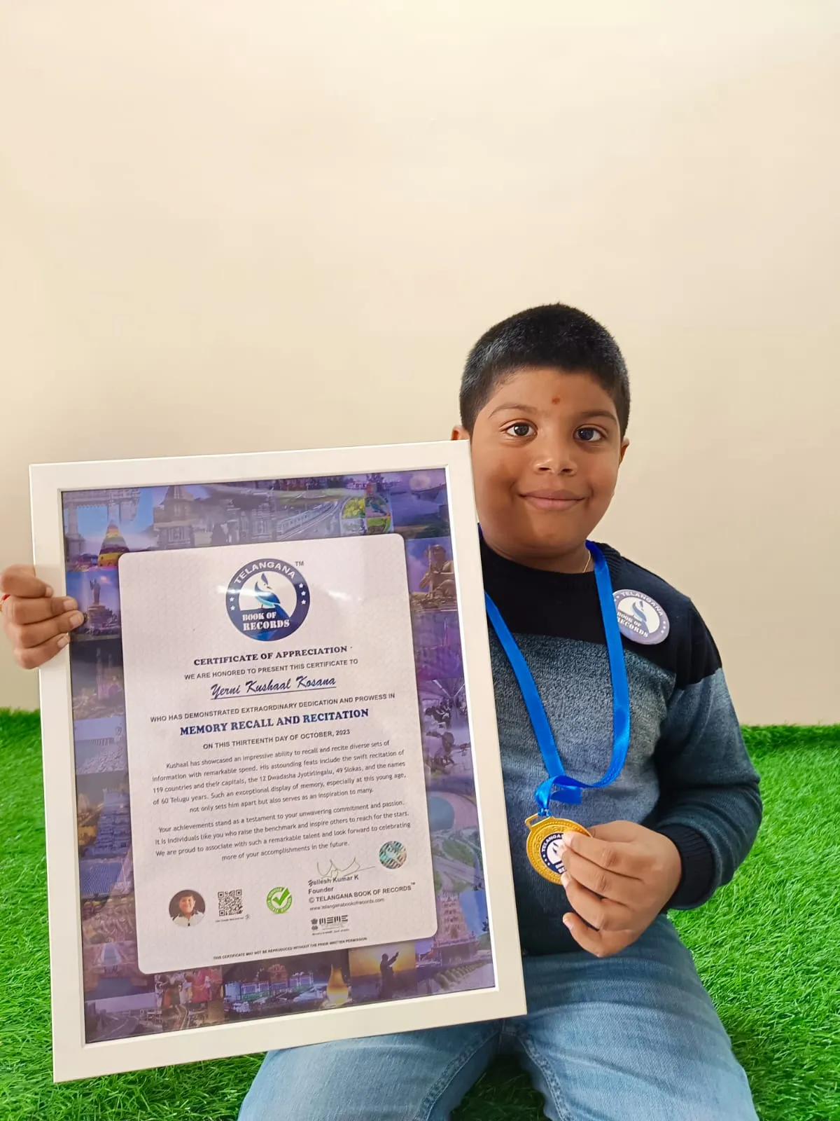 Kushaal has showcased an impressive ability to recall and recite diverse sets of information with remarkable speed. His astounding feats include the swift recitation of 119 countries and their capitals, the 12 Dwadasha Jyotirlingalu, 49 Slokas, and the names of 60 Telugu years. Such an exceptional display of memory, especially at this young age, not only sets him apart but also serves as an inspiration to many.
