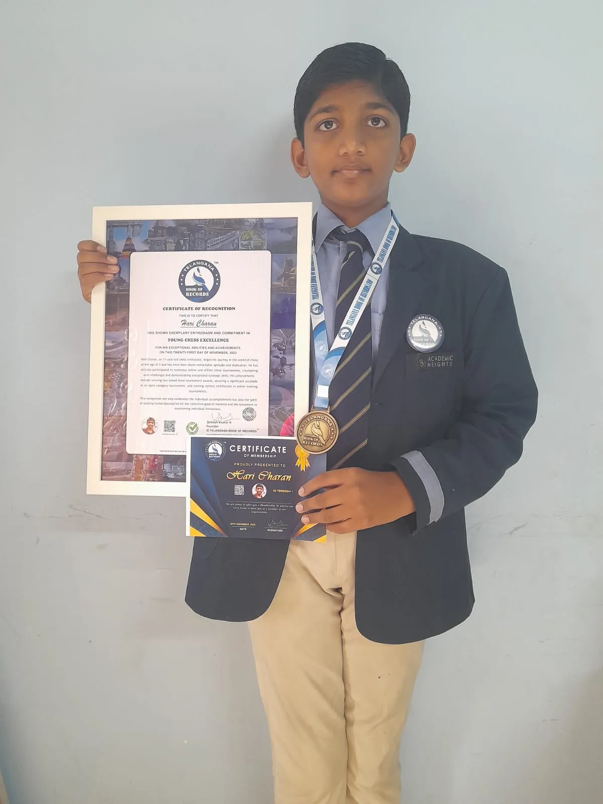 Hari Charan, an 11-year-old chess enthusiast, began his journey in the world of chess at the age of 5 and has since then shown remarkable aptitude and dedication. He has actively participated in numerous online and offline chess tournaments, triumphing over challenges and demonstrating exceptional strategic skills. His achievements include winning two school-level tournament awards, securing a significant accolade in an open category tournament, and earning various certificates in online training tournaments.