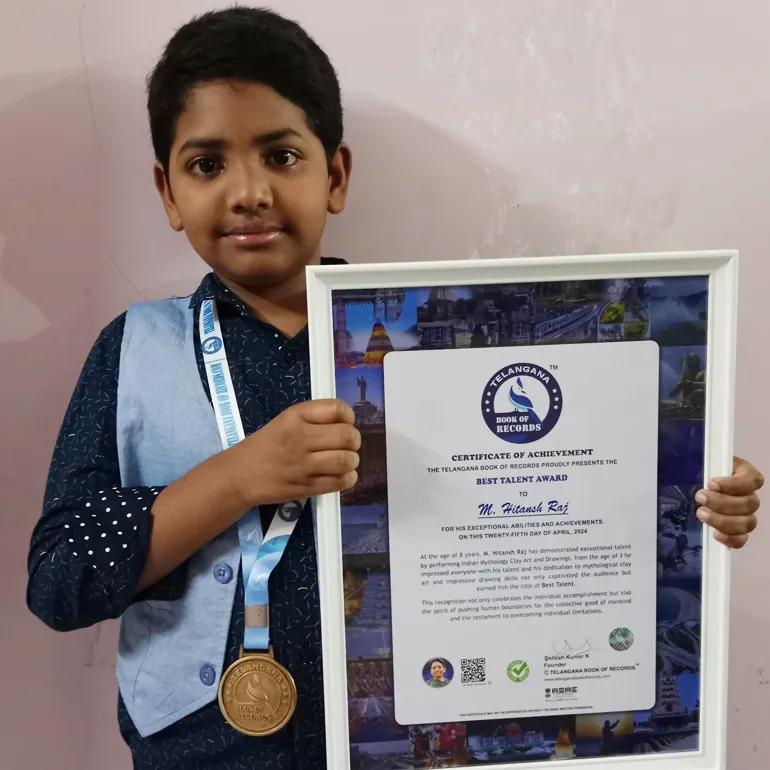 At the age of 8 years, M. Hitansh Raj has demonstrated exceptional talent by performing Indian Mythology Clay Art and Drawings, from the age of 3 he impressed everyone with his talent and his dedication to mythological clay art and impressive drawing skills not only captivated the audience but earned him the title of Best Talent.