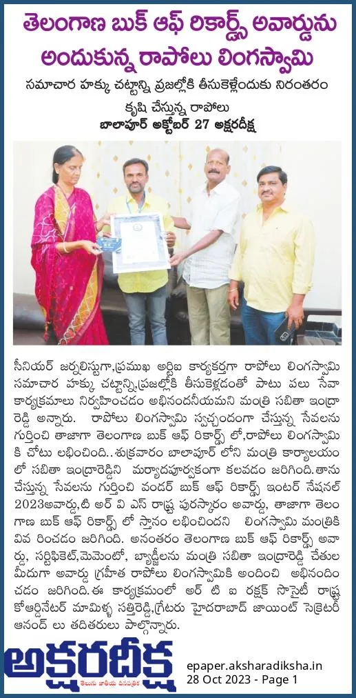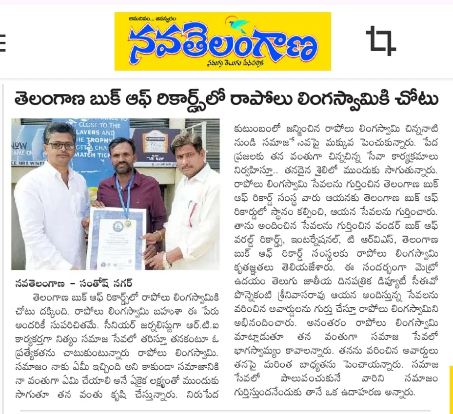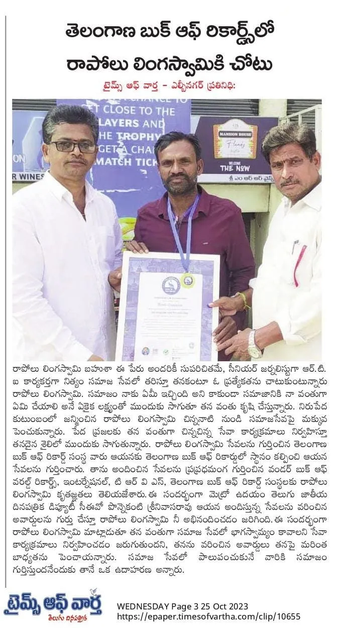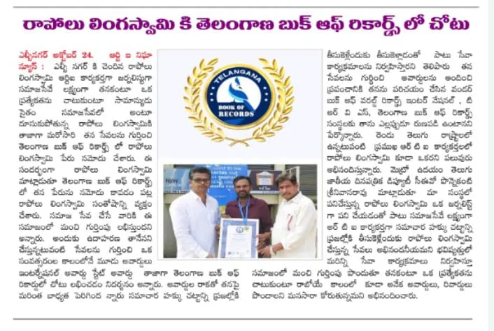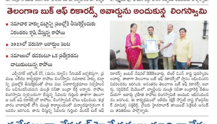 Rapolu Lingaswamy has carved a niche for himself as an RTI activist and journalist, passionately dedicating himself to truth and transparency. His fervor for journalism coupled with his activist spirit has led to significant recognitions, such as the "TRVS Telangana State Award". His relentless pursuit for truth and transparency stands as a testament to his dedication towards the collective good of society.