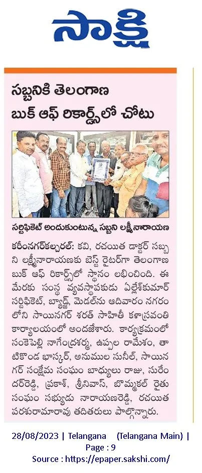 Exceptional adulation and ovation are extended to Sabbani Laxminarayana. A seasoned poet, Accomplished story writer, Insightful essayist, Adept Translator, Prolific novelist, and Evocative lyricist, his journey reflects unwavering dedication and creative prowess.