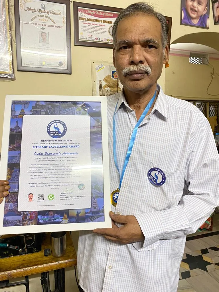Telangana Book of Records acknowledges this exceptional talent and wishes “Venkat Somayajula Anjaneyulu (Virinchi)” continued success in all her endeavors.